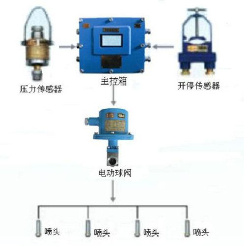 只有水壓傳感器檢測(cè)到采煤機(jī)水采水路中有一定的水壓(或工作燈開啟)時(shí),才能允許啟動(dòng)采煤機(jī)。采煤機(jī)開動(dòng)后,開停傳感器(或光控傳感器)將信號(hào)送入主控箱,主控箱控制電動(dòng)球閥開啟,實(shí)現(xiàn)對(duì)產(chǎn)塵點(diǎn)進(jìn)行噴霧降塵。采煤機(jī)停機(jī)(或采煤機(jī)工作燈關(guān)閉)后,主控箱控制電動(dòng)球閥延時(shí)一定的時(shí)間后關(guān)閉,停止噴霧降塵。