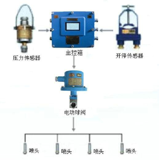 主控箱安裝在采煤機(jī)機(jī)頭位置,接AC127V電源。電動(dòng)球閥串接在水幕與進(jìn)水管之間。水壓傳感器安裝在灑水噴霧的水路中,開停傳感器安裝在采煤機(jī)動(dòng)力電纜上(或?qū)⒐饪貍鞲衅靼惭b到采煤機(jī)工作燈的上方)。
