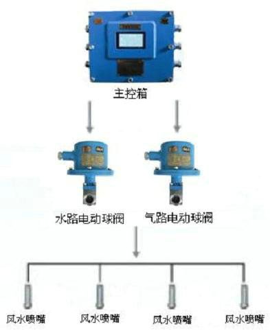 當(dāng)傳感器探測(cè)到控制信號(hào)時(shí),信號(hào)送入主控箱,主控箱先后控制高壓風(fēng)閥、高壓水閥開(kāi)啟,將高壓風(fēng)、高壓水輸送到風(fēng)水噴頭(即氣水噴頭)進(jìn)行噴霧降塵(風(fēng)水噴頭可對(duì)風(fēng)水壓力大小進(jìn)行調(diào)整),噴霧工作至延時(shí)時(shí)間(延時(shí)可調(diào))停止噴霧降塵;當(dāng)信號(hào)再次觸發(fā)時(shí),進(jìn)行下一個(gè)工作循環(huán)過(guò)程。